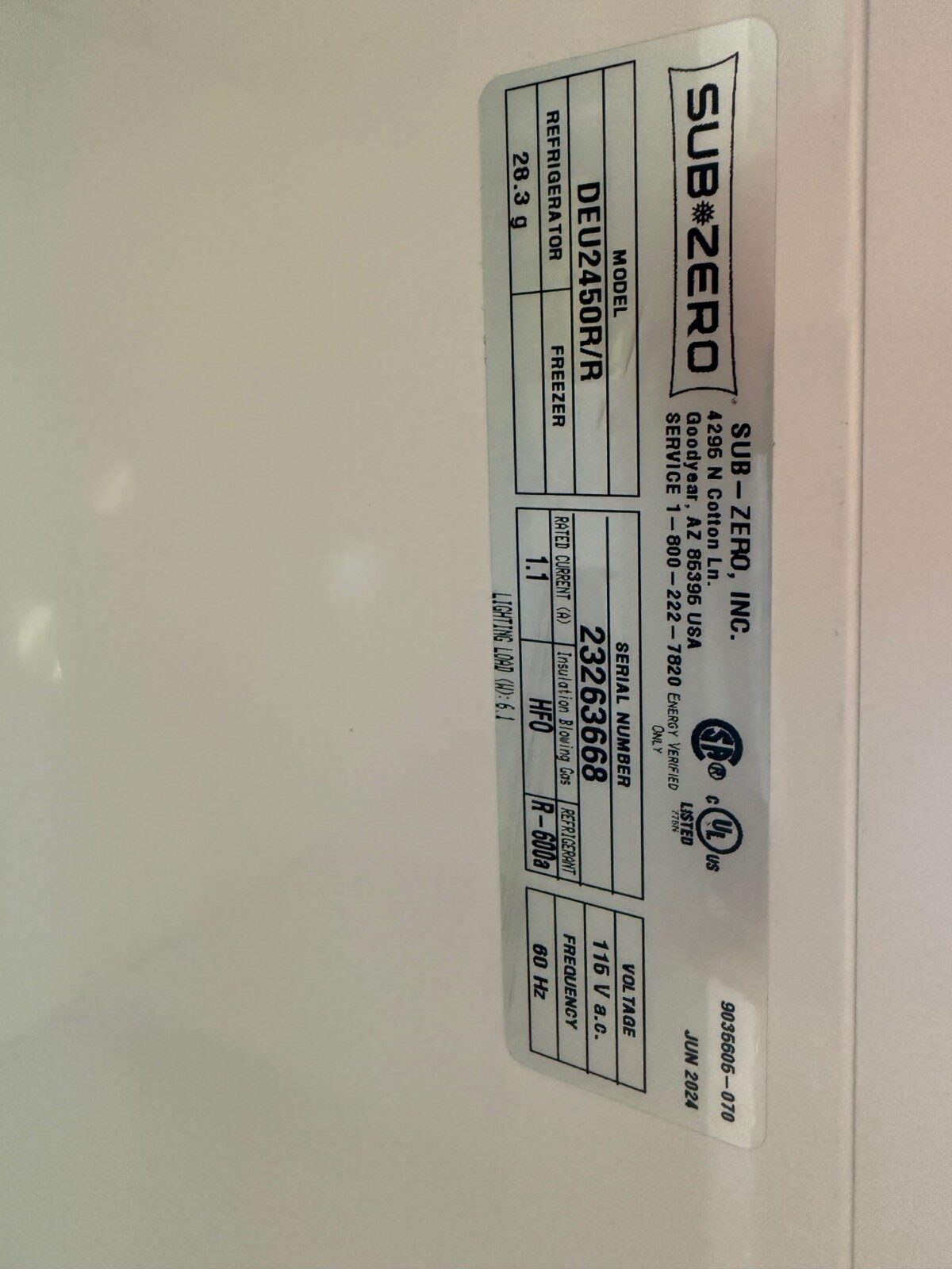 24” Sub Zero DEU2450RR