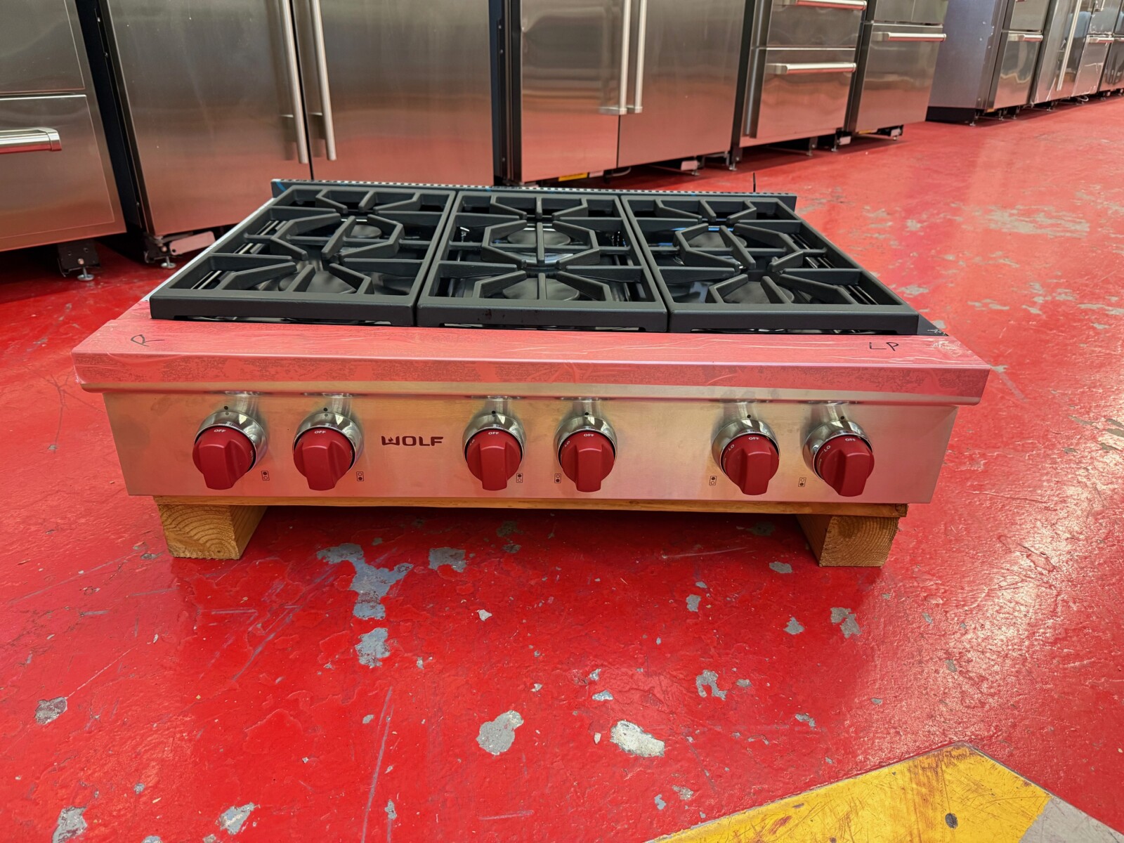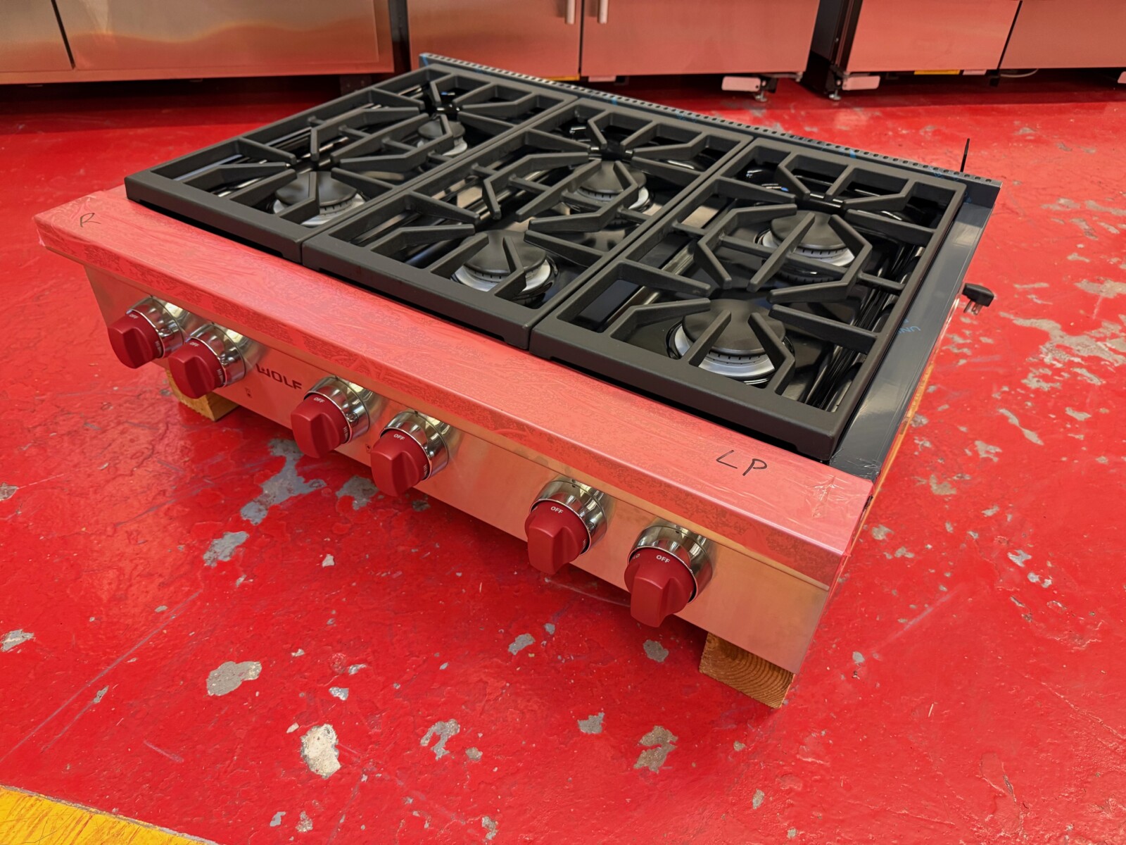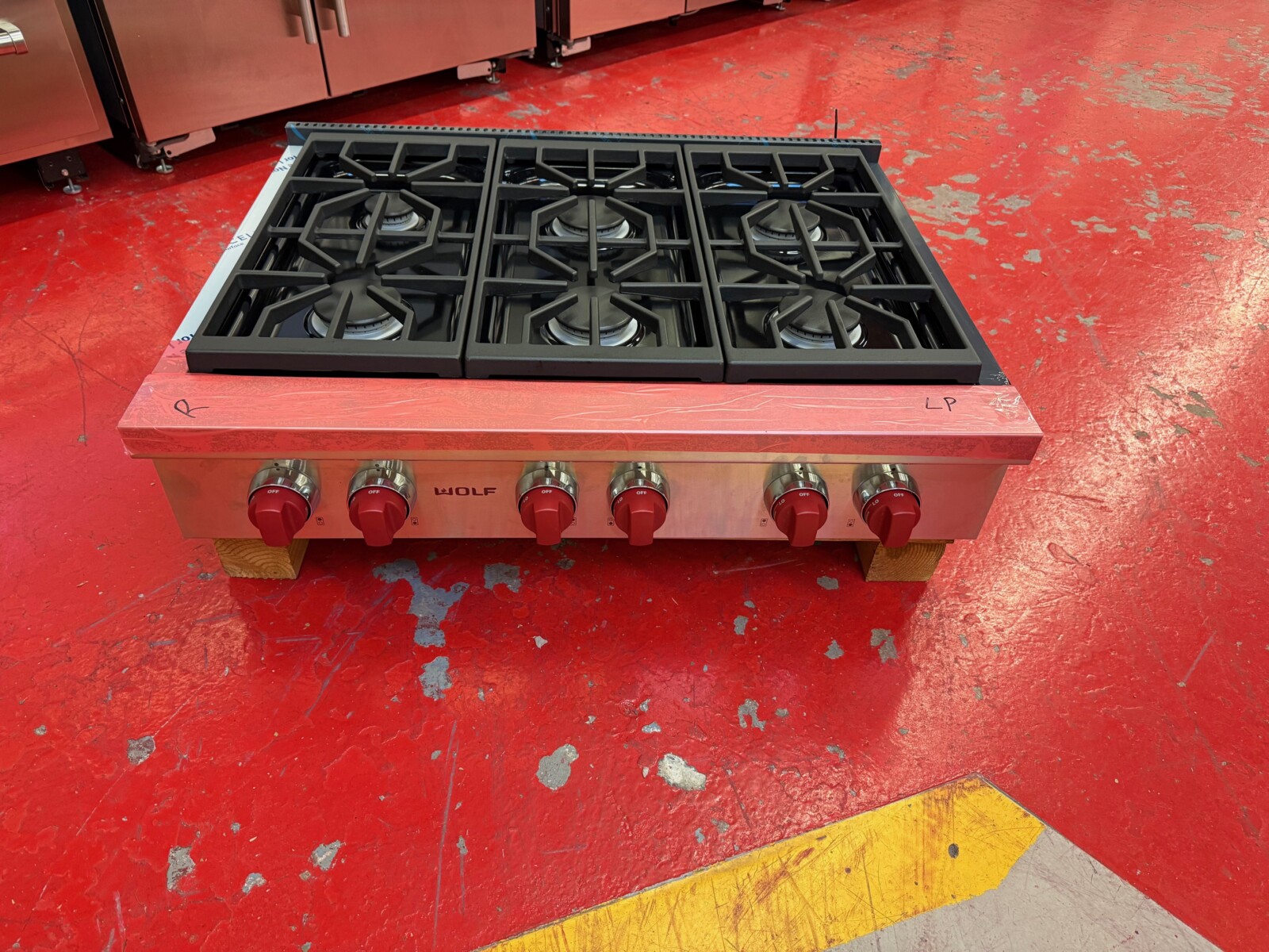 36 Inch Pro-Style Propane Rangetop with 6 Dual-Stacked Sealed Burners, Porcelain-Coated Cast Iron Continuous Grates, Simmer/Melt Feature, Automatic Reignition and Star-K Certified: Liquid Propane.