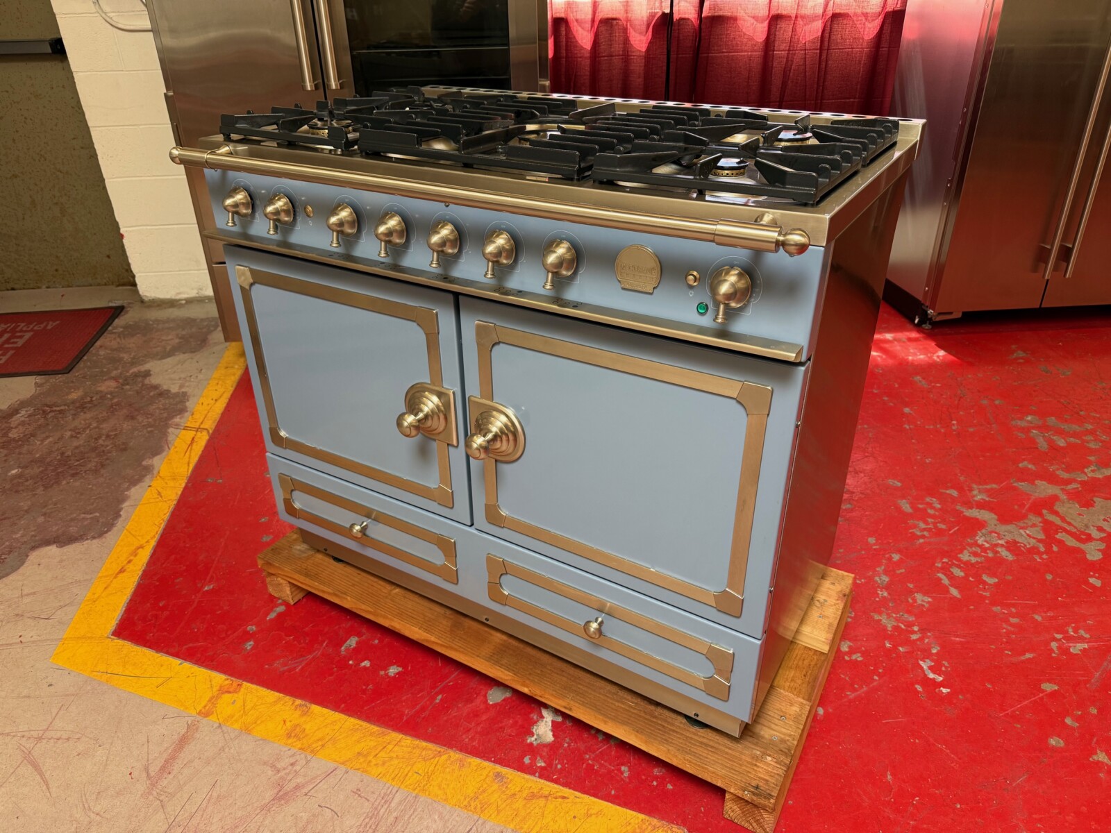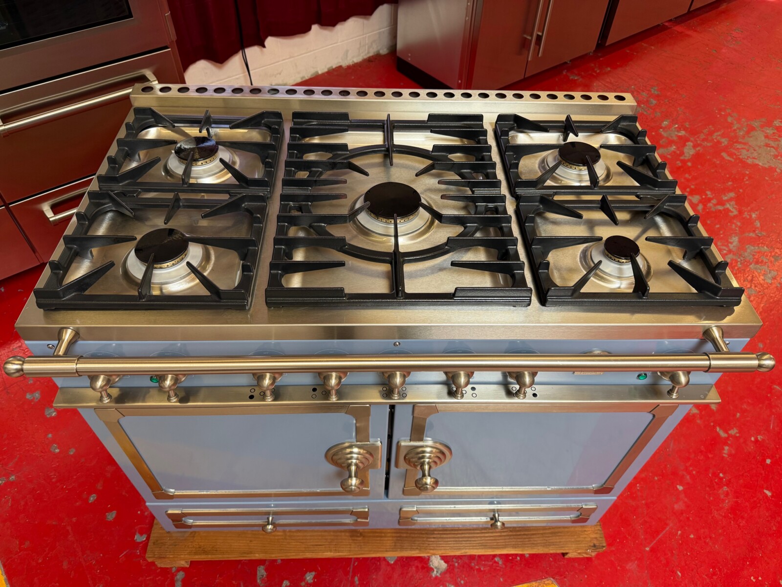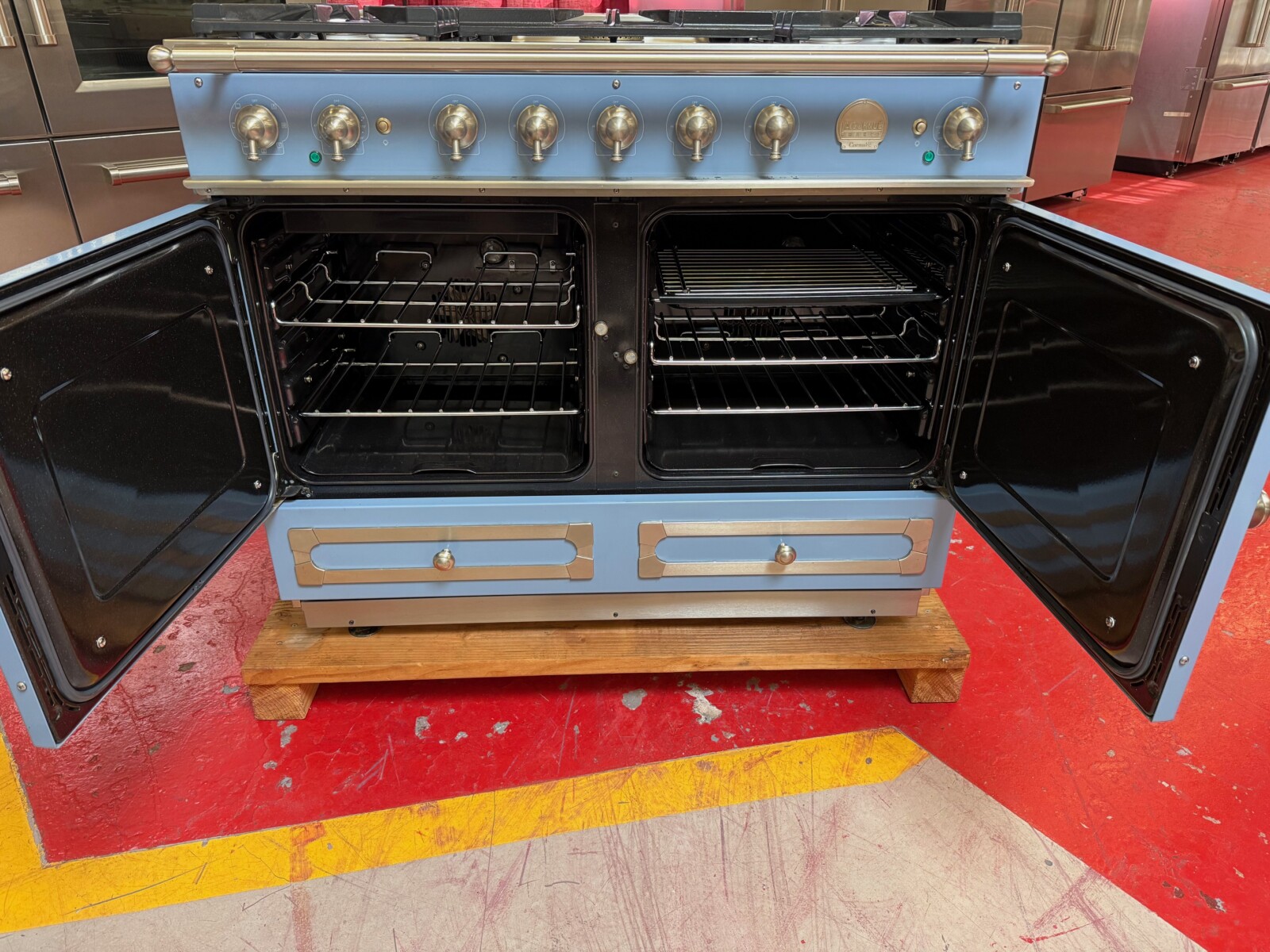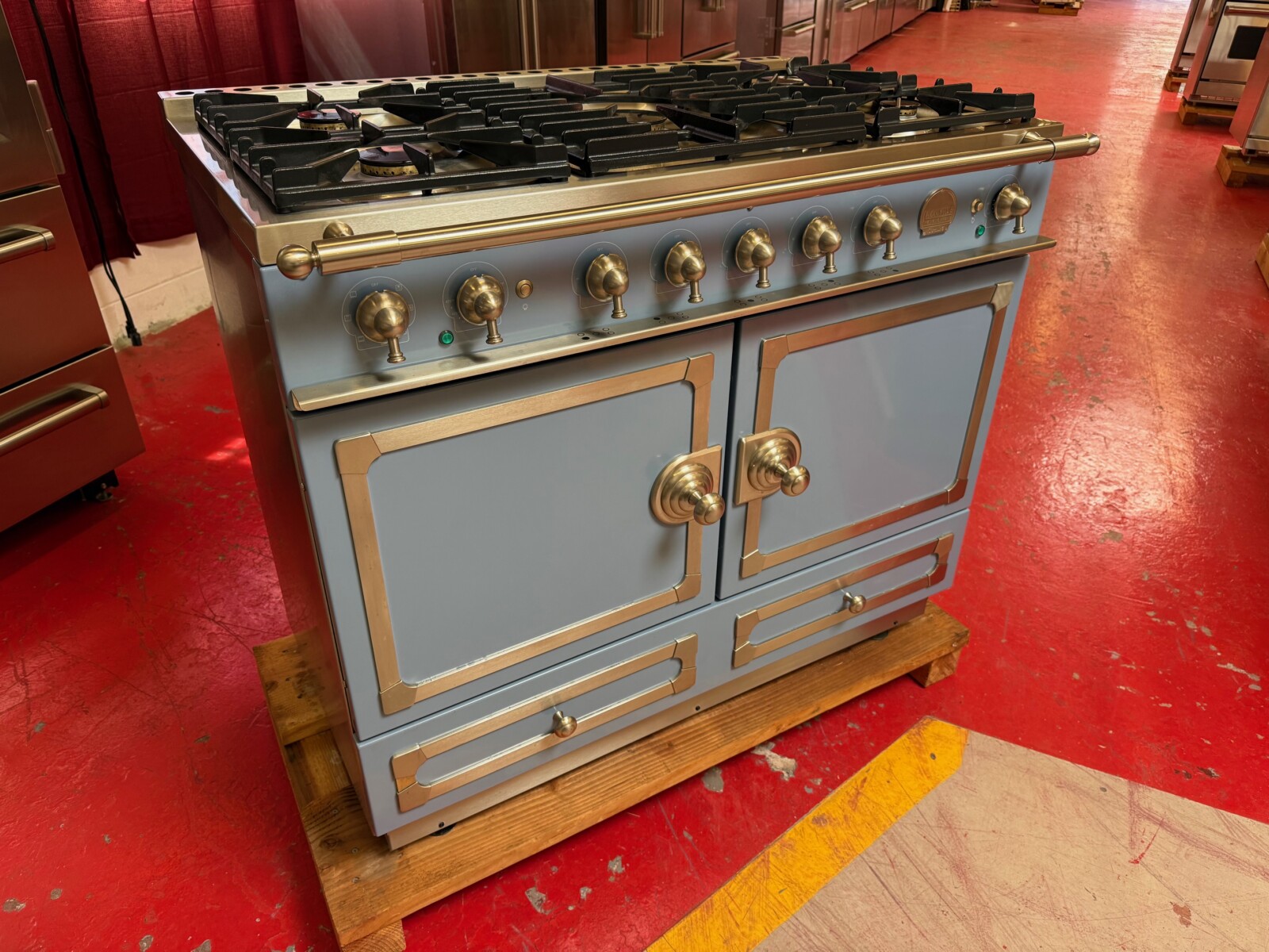 43 Inch Freestanding Dual Fuel Range with 5 Sealed Burners, Double Oven, 4.59 Cu. Ft. Total Capacity, Storage Drawer, Continuous Grates, Convection Ovens, and 7 Cooking Modes: Provence Blue with Stainless Steel and Satin Chrome Trim.