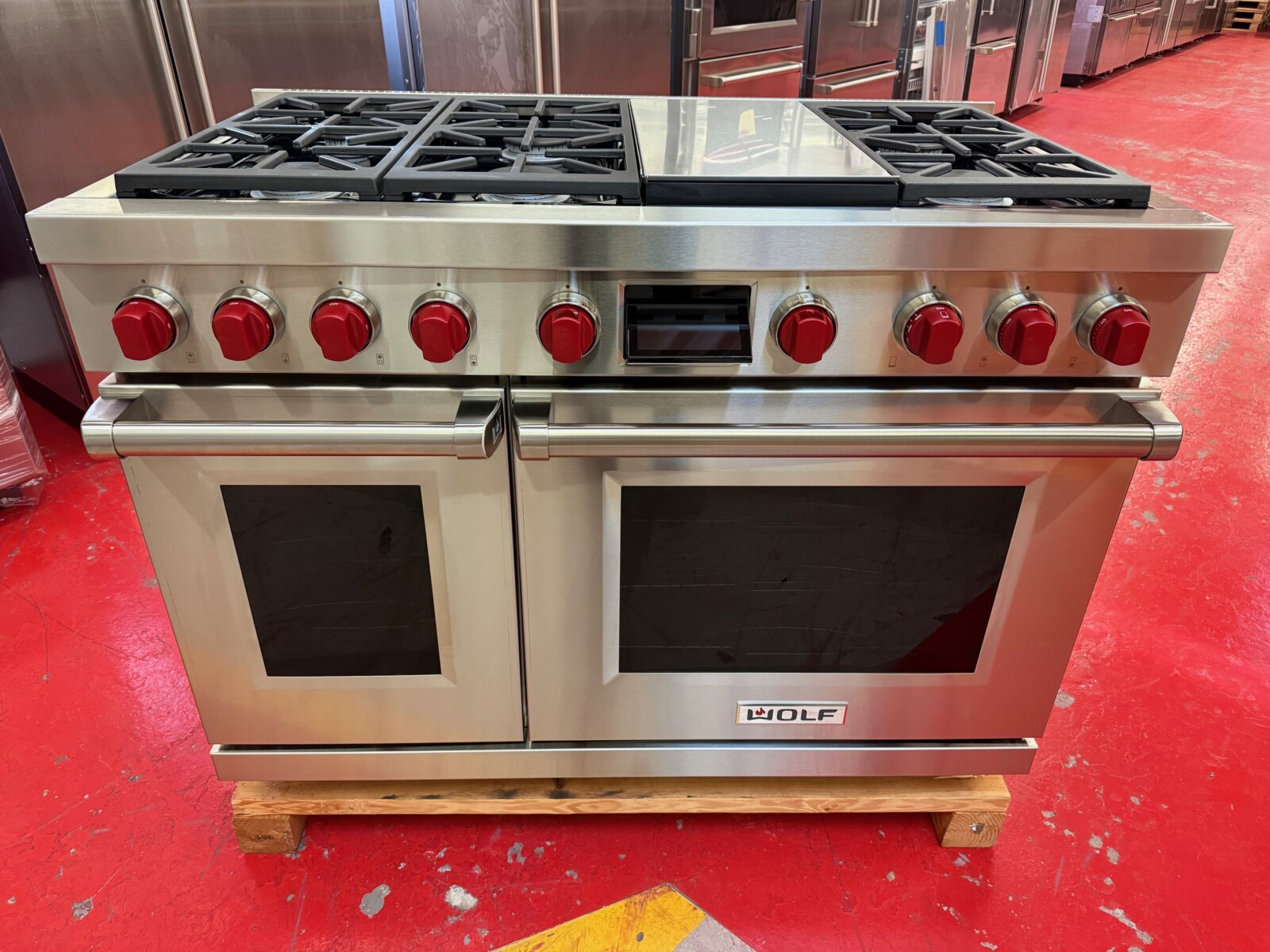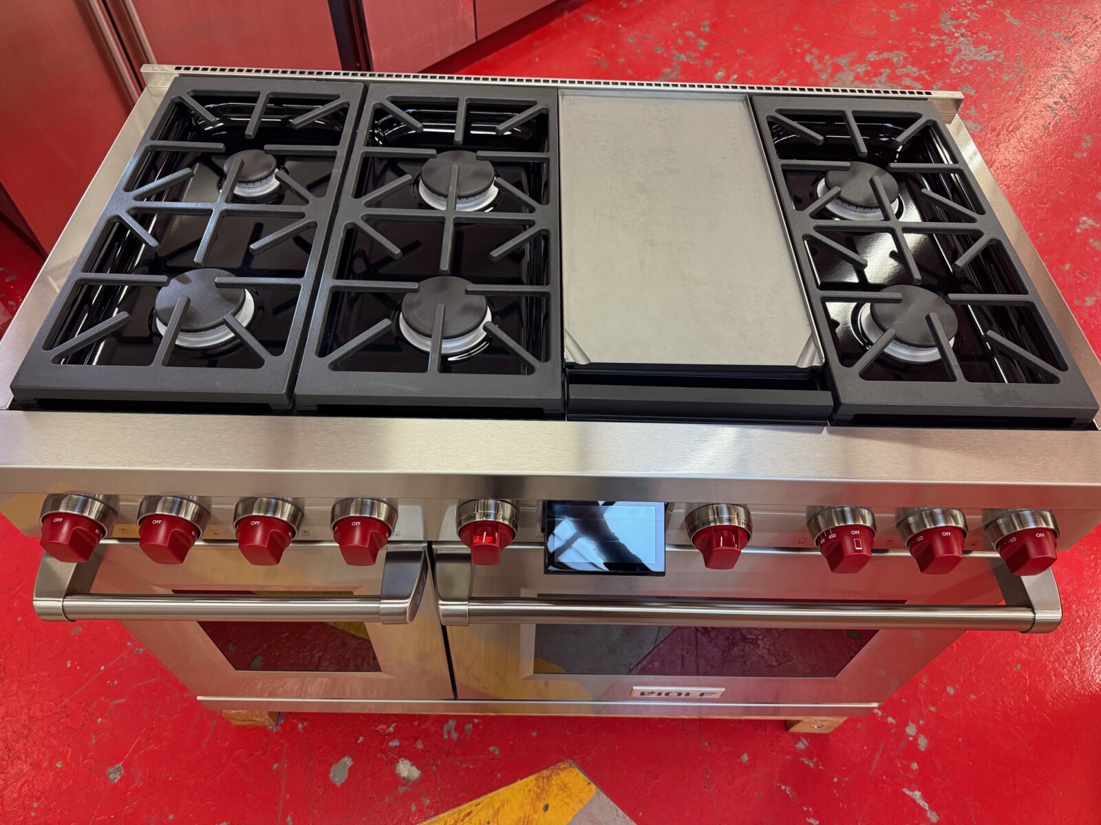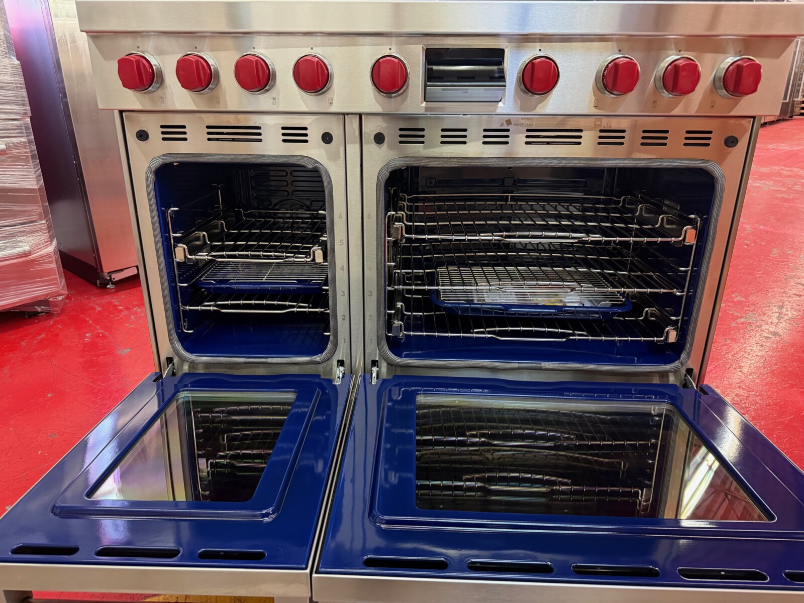 48 Inch Freestanding Dual-Fuel Smart Range with 6 Dual Stacked Sealed Burners, Double Oven, 7.8 cu. ft. Total Oven Capacity, Continuous Grates, Infrared Griddle, Self-Clean, Gourmet Mode, Touch Screen Controls, 10 Cooking Modes, Halo Lights, Temperature Probe, Sabbath Mode and STAR-K Certified: Stainless Steel – Natural Gas.