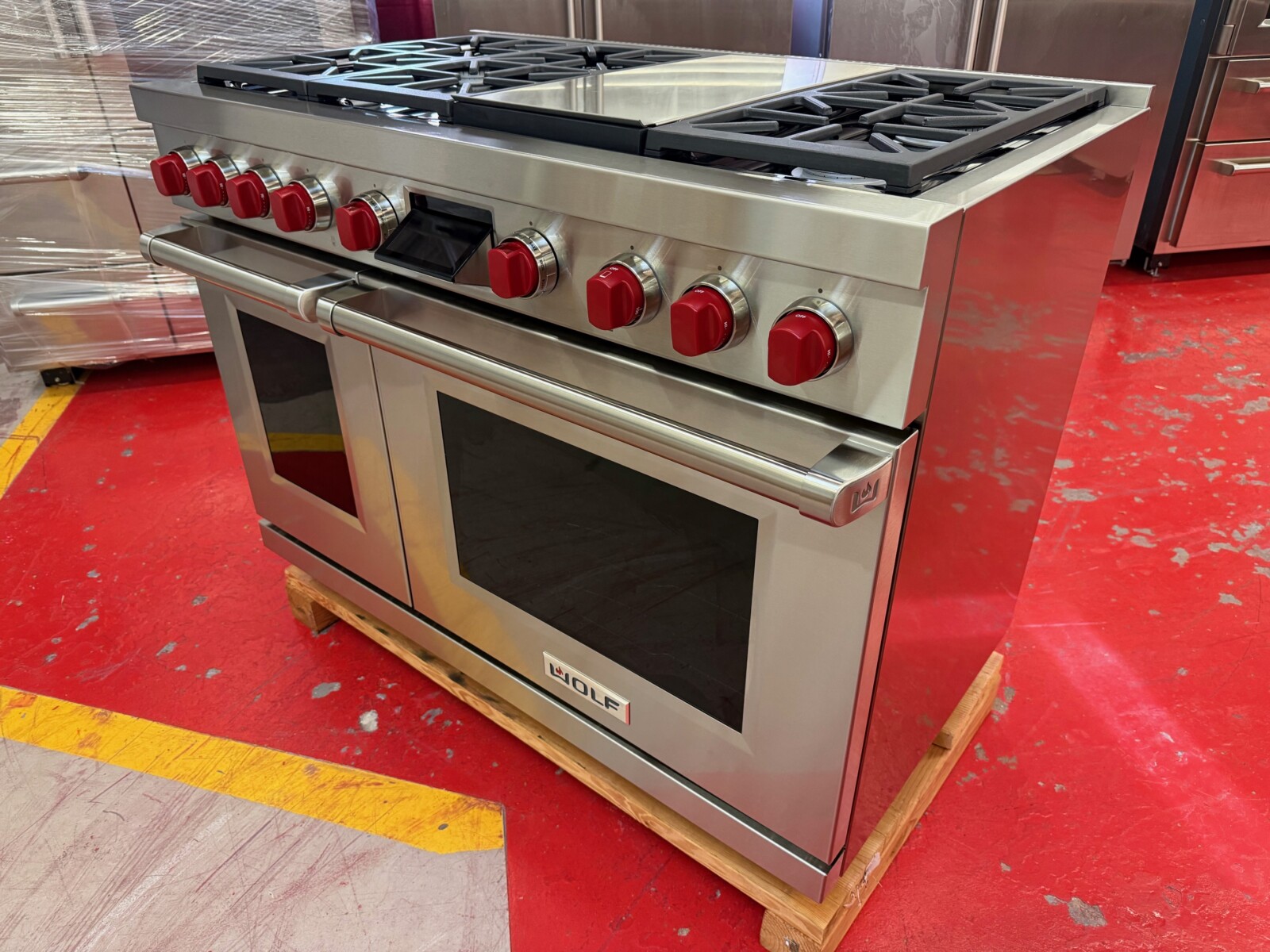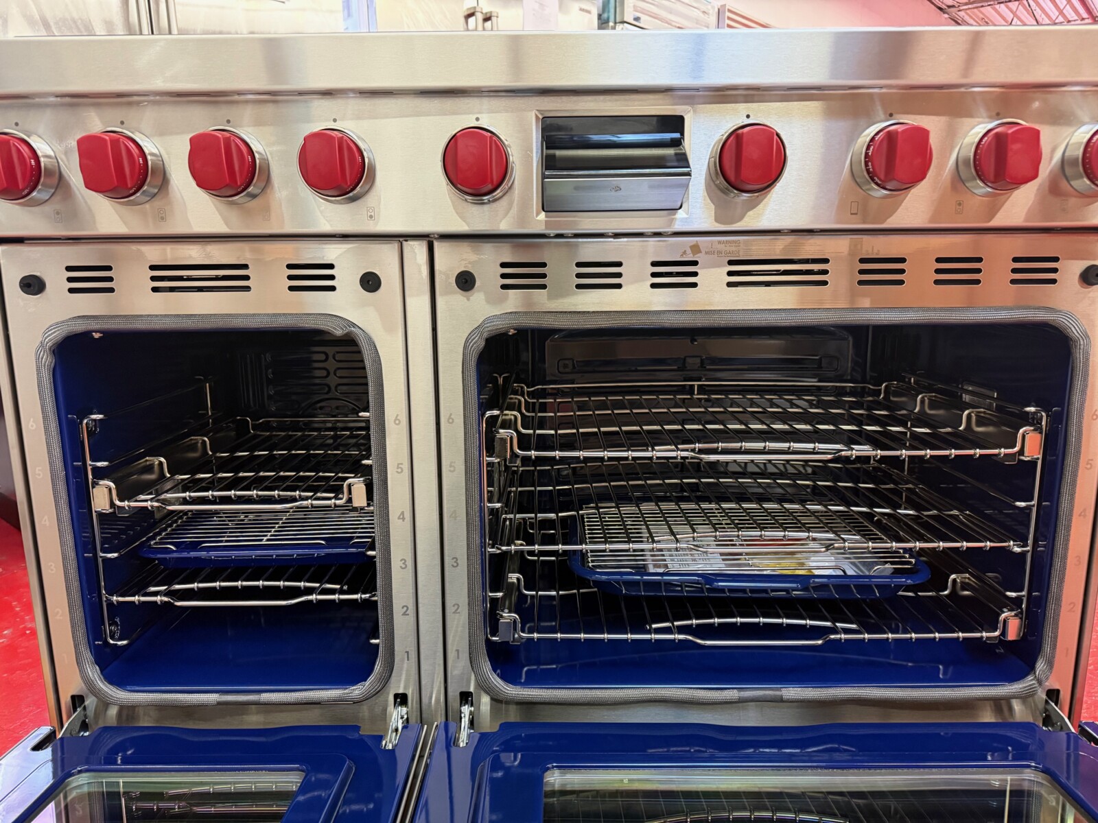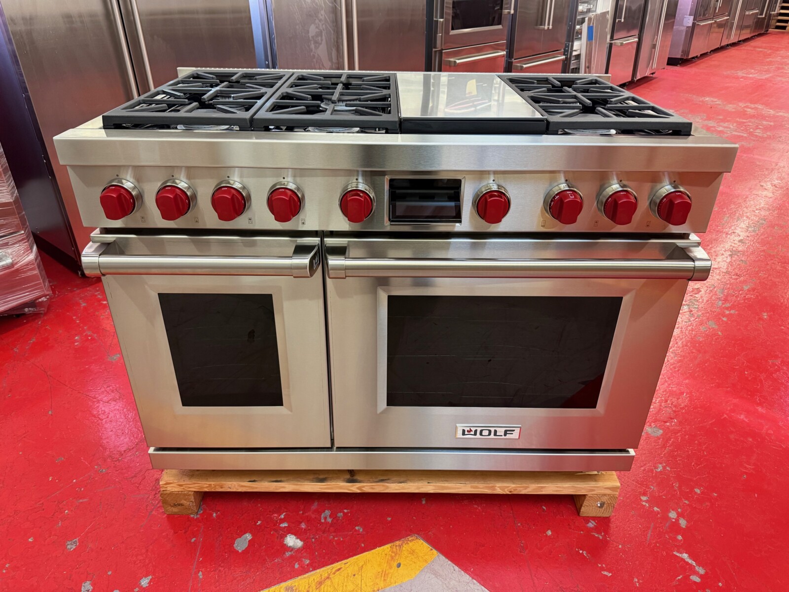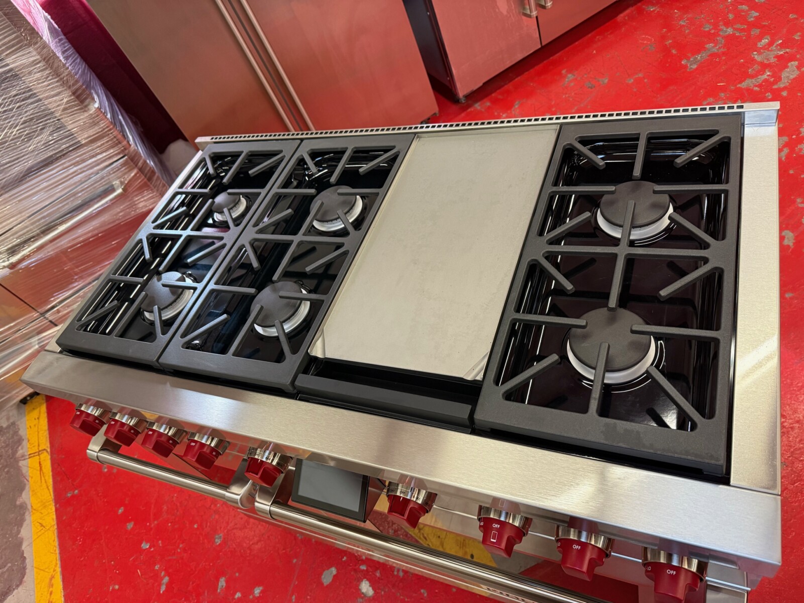 48 Inch Freestanding Dual-Fuel Smart Range with 6 Dual Stacked Sealed Burners, Double Oven, 7.8 cu. ft. Total Oven Capacity, Continuous Grates, Infrared Griddle, Self-Clean, Gourmet Mode, Touch Screen Controls, 10 Cooking Modes, Halo Lights, Temperature Probe, Sabbath Mode and STAR-K Certified: Stainless Steel – Natural Gas.