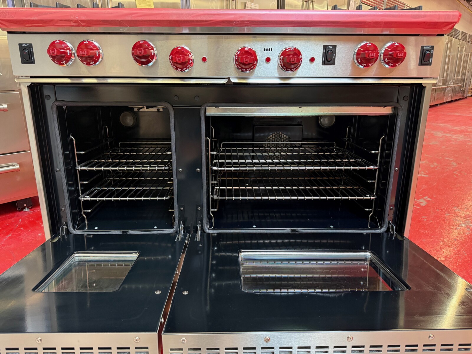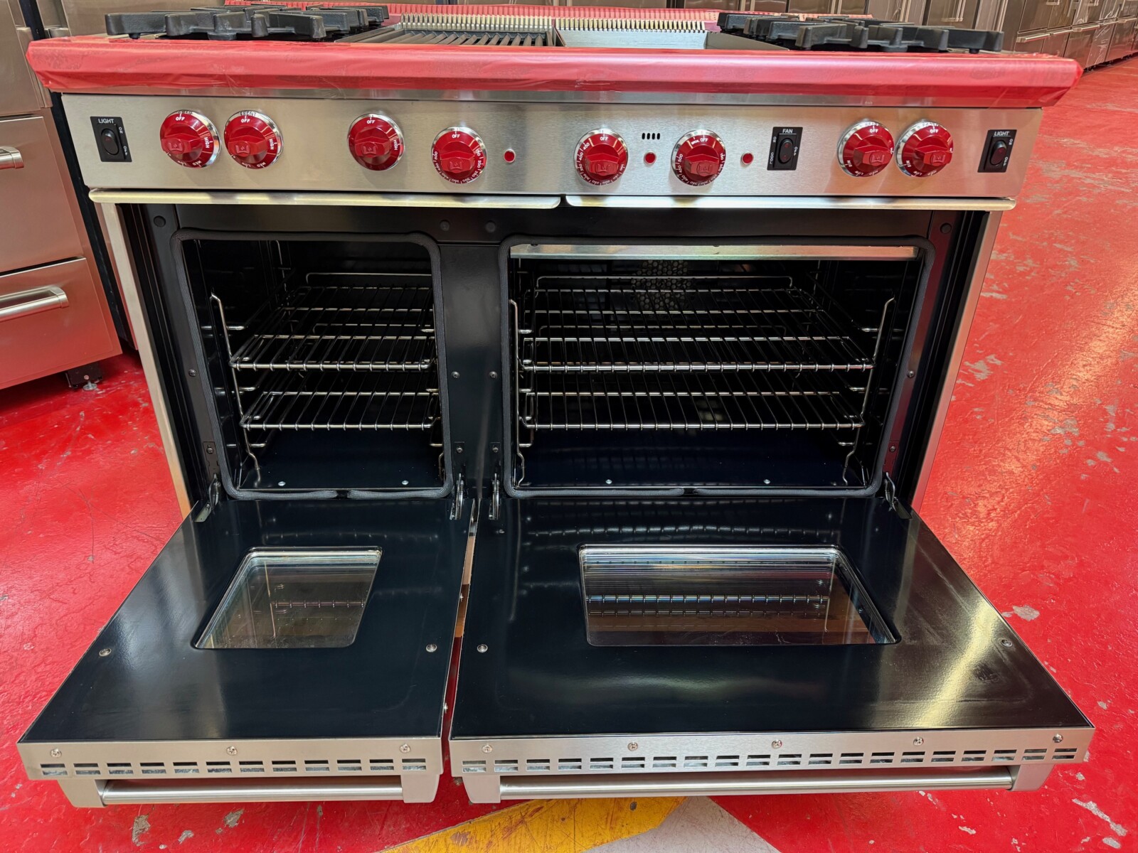 48 Inch Pro-Style Gas Range with 4 Dual Brass Open Burners, 4.4 cu. ft. Convection Main Oven, Infrared Broiler, Infrared Griddle/Charbroiler, Automatic Reignition and Drip Tray: Natural Gas.