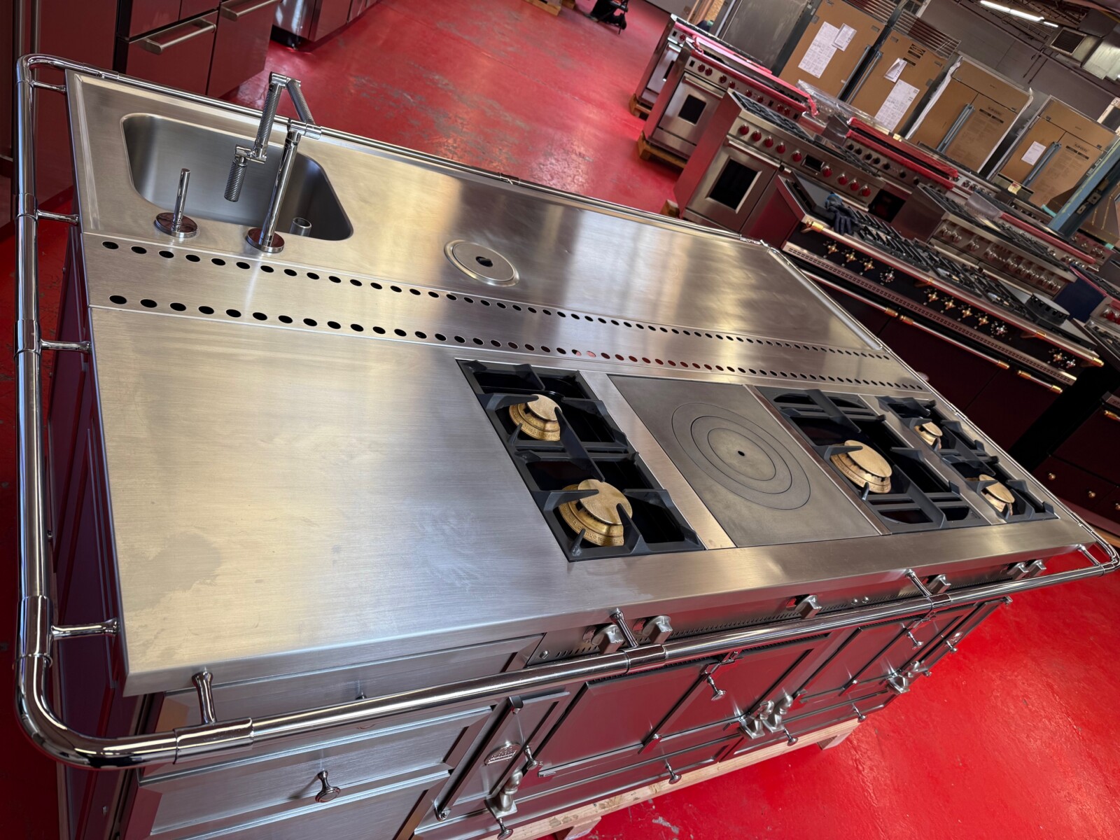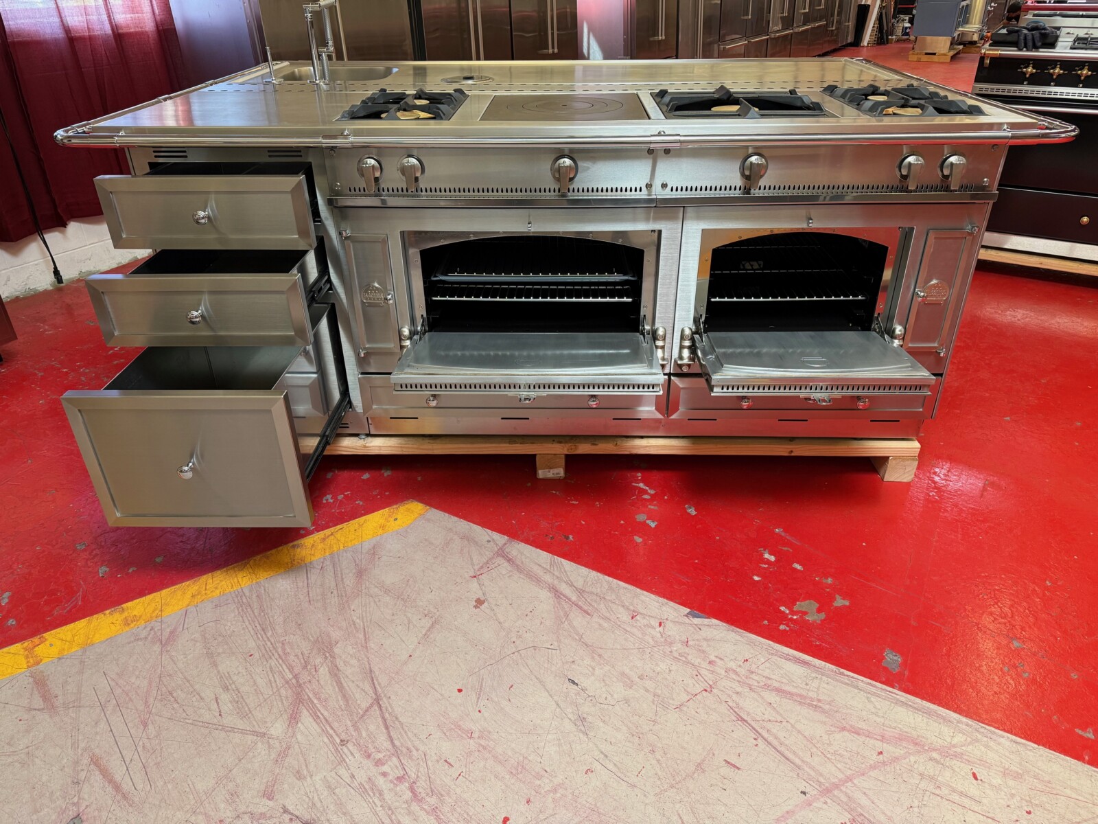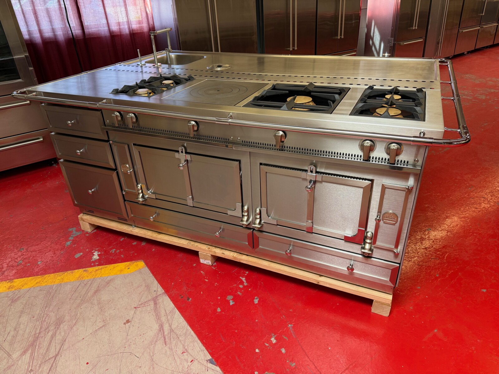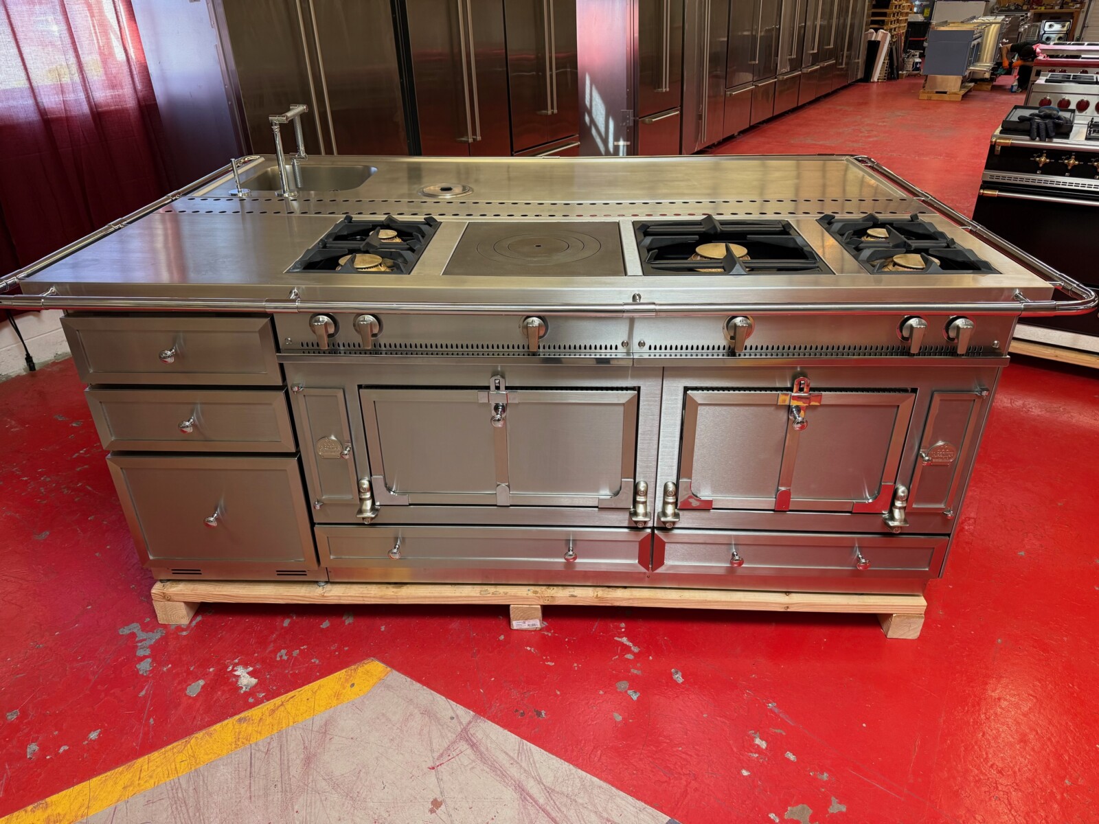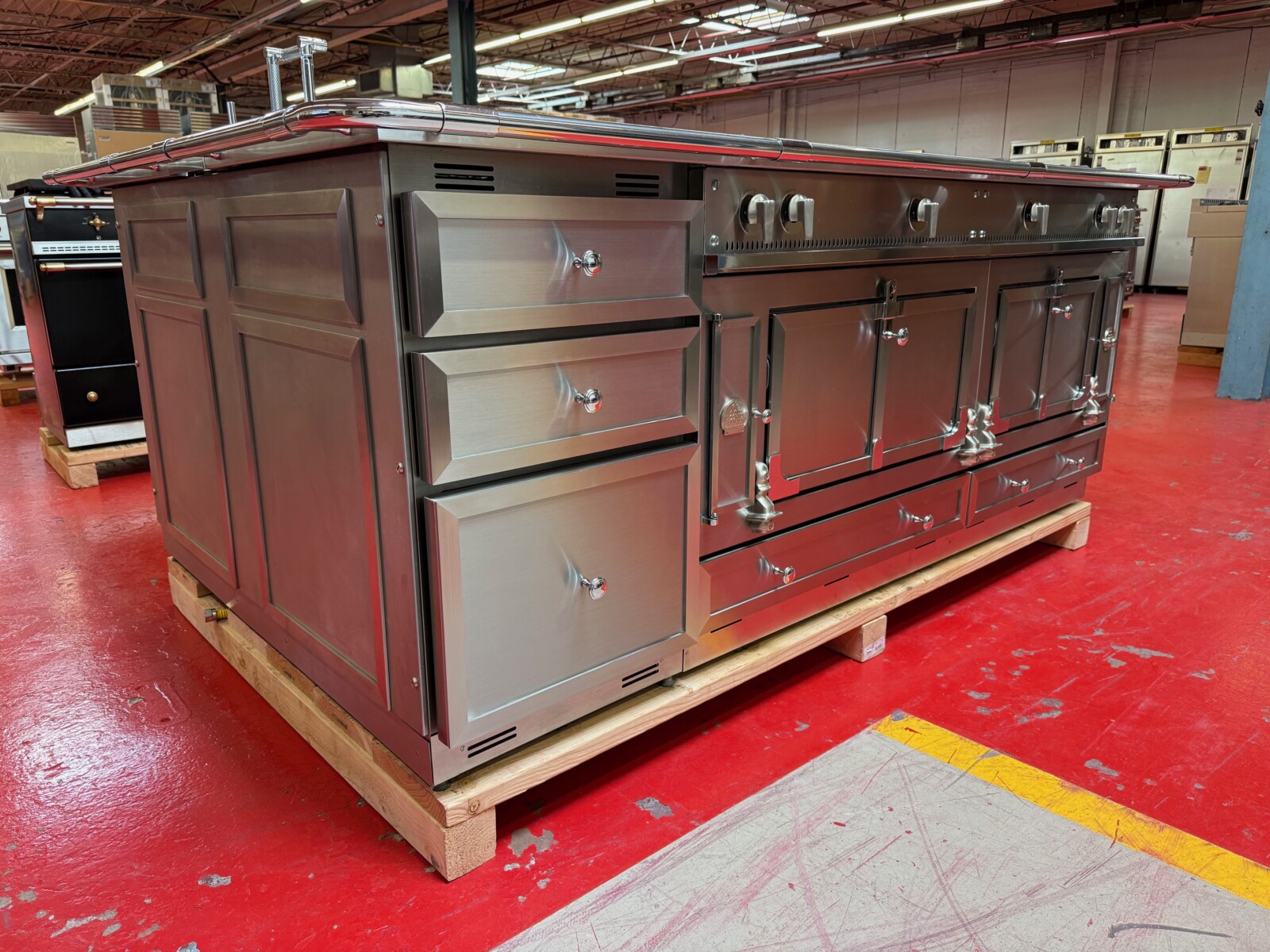The island is La Cornue as well. There is a 24” space for a Dishwasher or Beverage center or even a Wine Fridge. Total size of the island is 95”x63” including the bar.