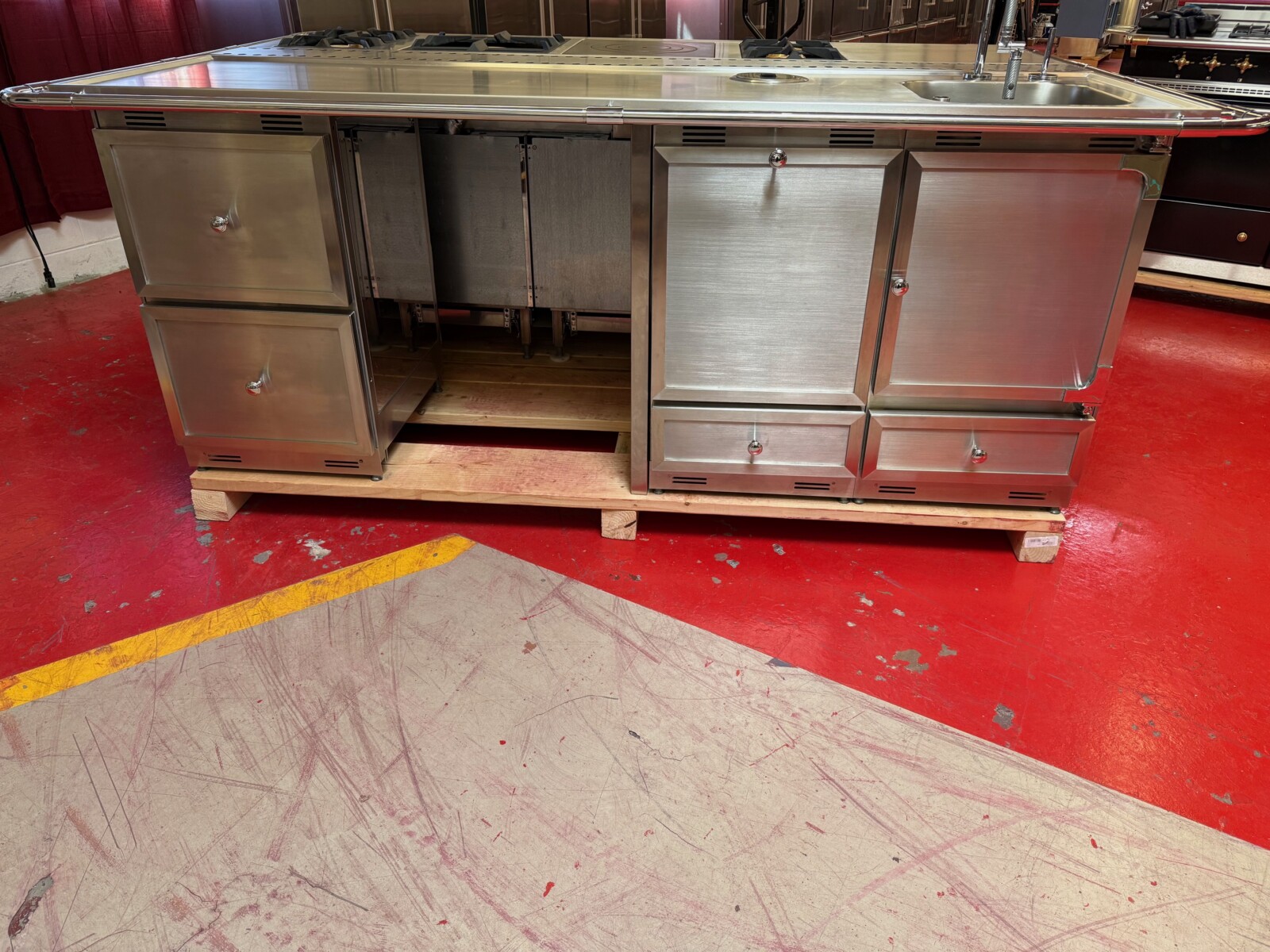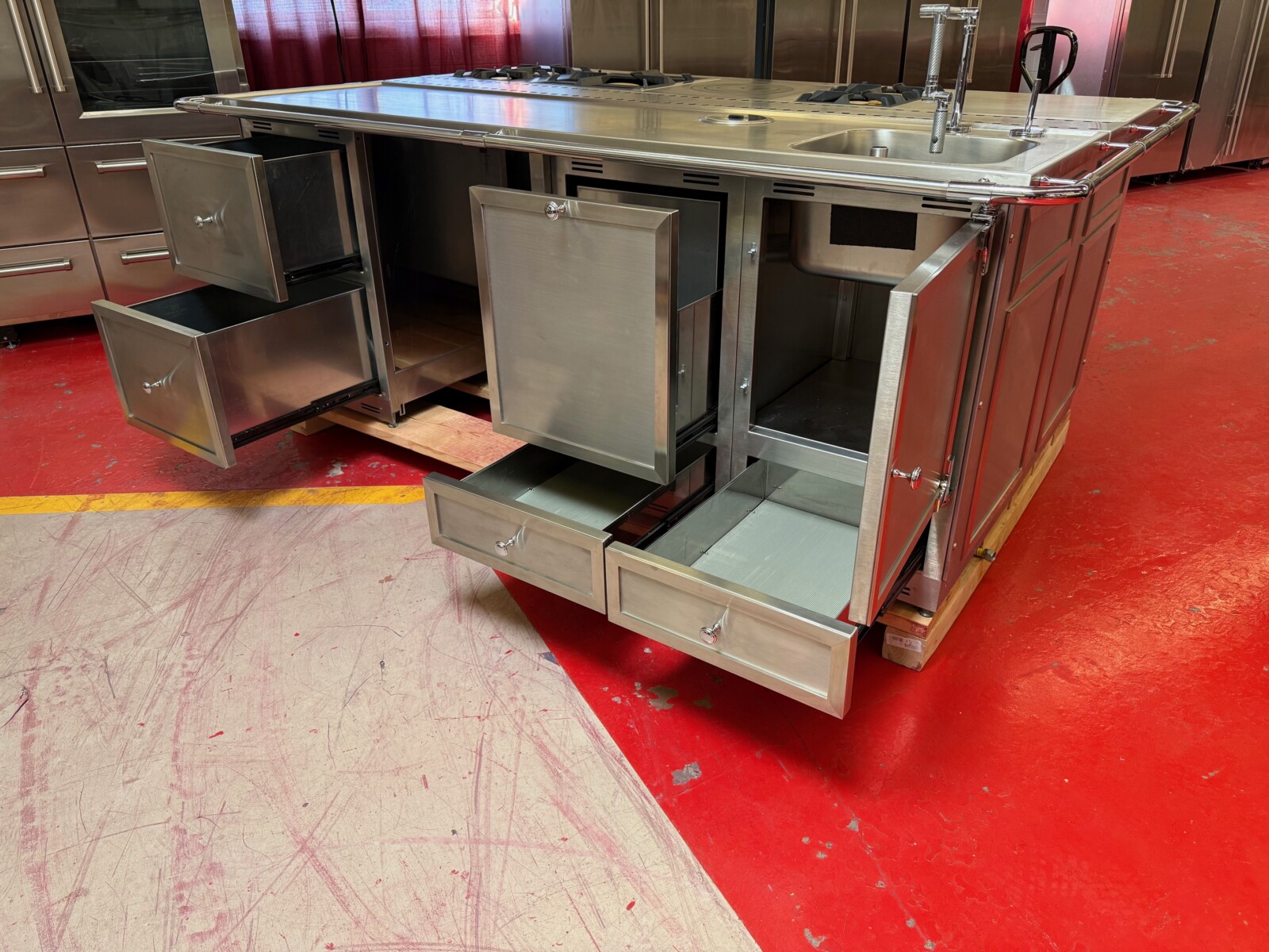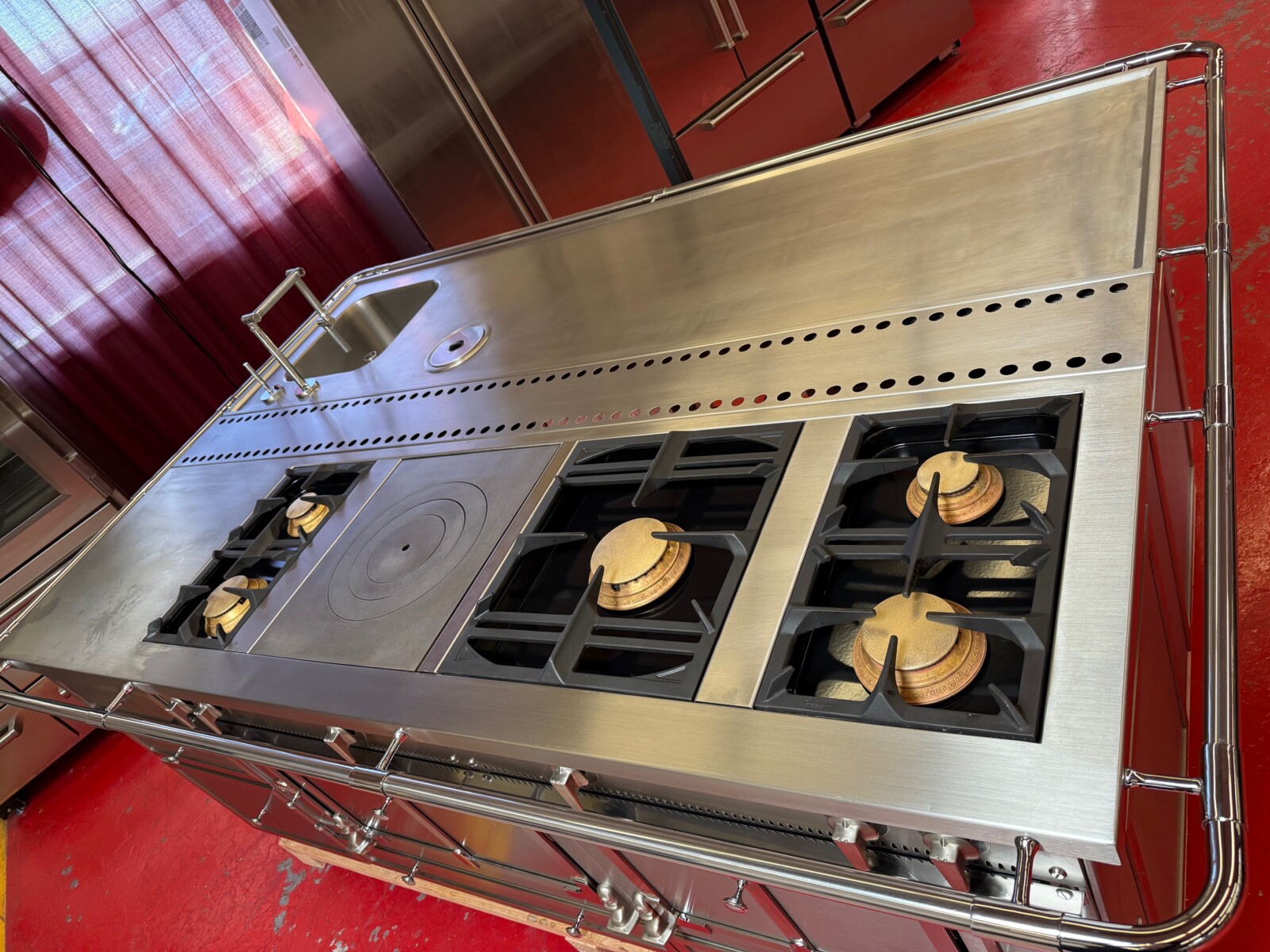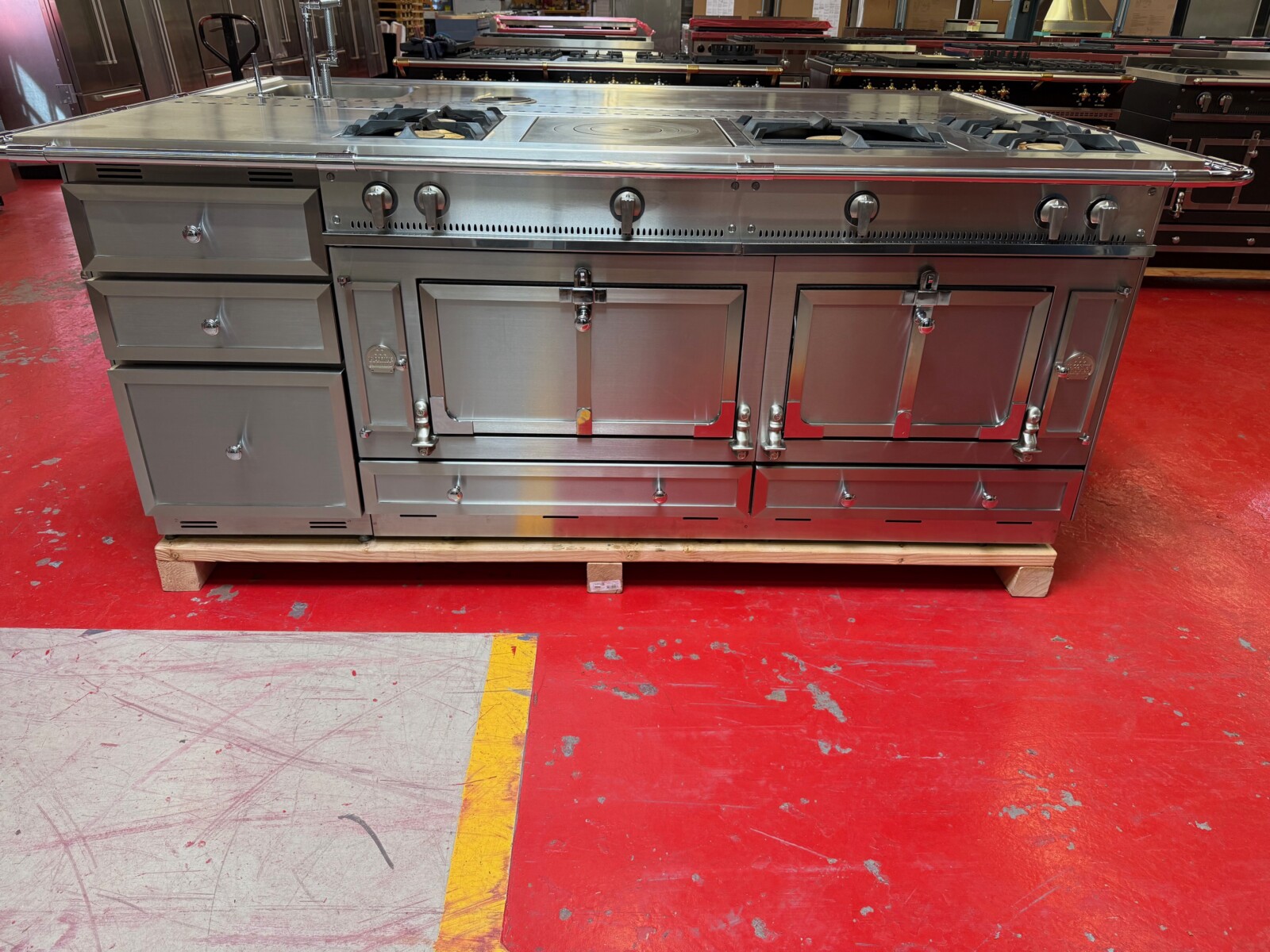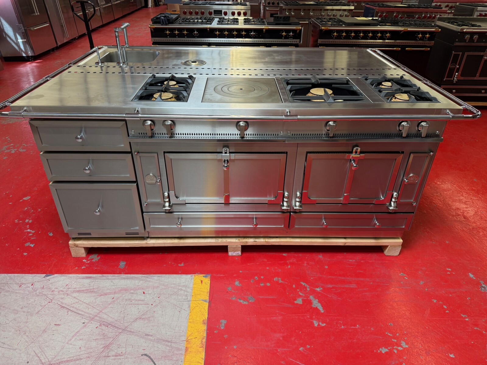 The island is La Cornue as well. There is a 24” space for a Dishwasher or Beverage center or even a Wine Fridge. Total size of the island is 95”x63” including the bar.